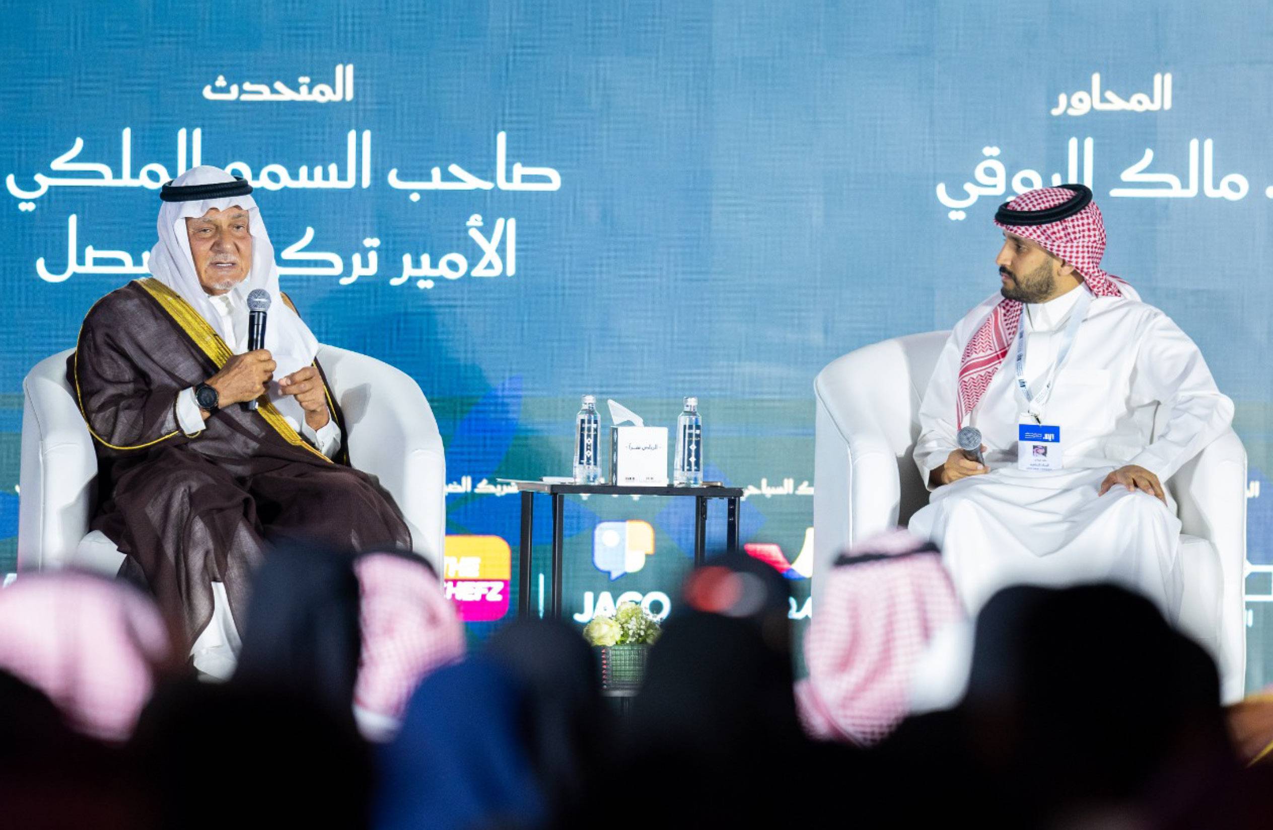 صاحب السمو الملكي الأمير تركي الفيصل، رئيس مجلس إدارة مركز الملك فيصل للبحوث والدراسات الإسلامية يحلّ ضيفًا على معرض الرياض الدولي للكتاب، يوم السبت ۱۲ ربيع الآخر ۱٤٤۷هـ، الموافق ٤ أكتوبر ۲۰۲٥م، في حوار أداره الإعلامي مالك الروقي، تناول عددًا من القضايا السياسية والثقافية، وسط حضور كبير من زوّار المعرض.
